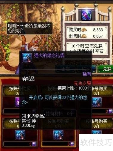 9、 在地轨中心NPC红尾乔纳森的时空石商店中,可用3个精炼时空石换取1个强力怨念礼袋。礼袋内容随机,包含3种远古材料之一,每日6点刷新,存在无货情况。