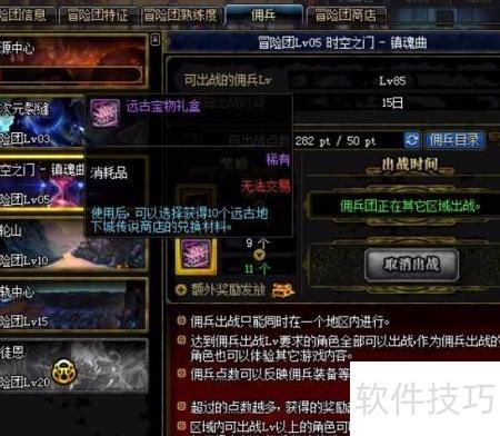 12、 冒险团等级达到5级以上,派遣佣兵前往时空之门—镇魂曲,15天后即可领取自选远古材料的宝物礼盒。