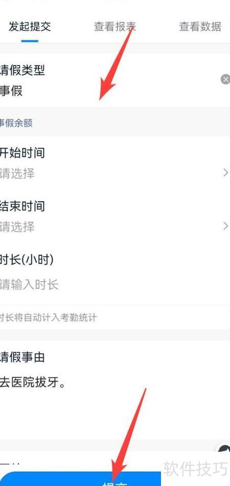 4、 选定请假类型后,设置起止时间,填写事由并提交申请。
