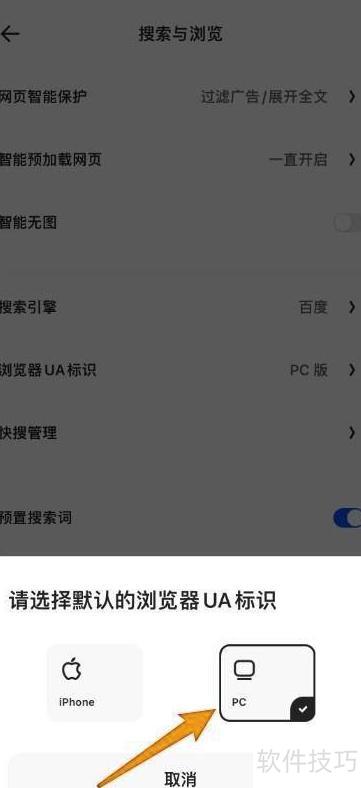 3、 进入搜索浏览页,点击浏览器UA标识选项