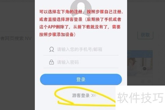 5、 选择账户登录或注册账号,添加的设备信息将保存在账户中,更换手机或重装软件后只需登录即可恢复。若使用游客模式,一旦更换设备或卸载重装,需重新添加设备。