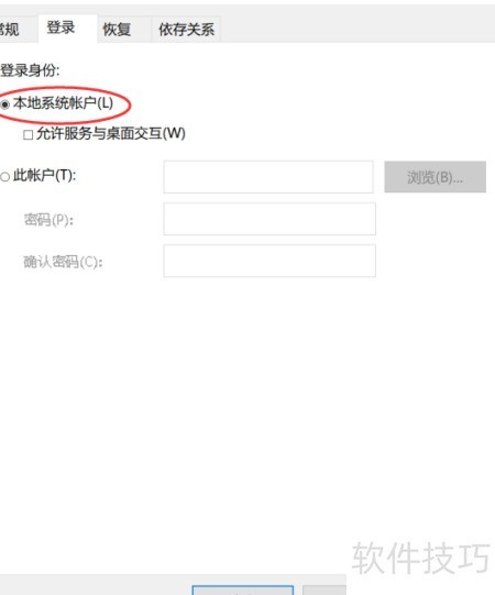 8、 需将登录身份设为本地系统账户后,方可启动相同愁驾。