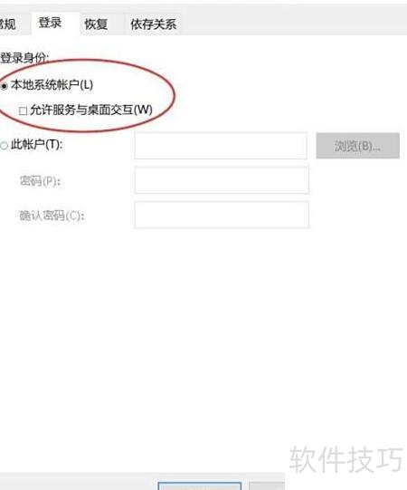 3、 双击打开属性,选择本地系统账户作为登录身份