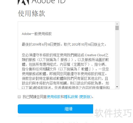5、 勾选同意Adobe条款后,点击继续按钮即可。