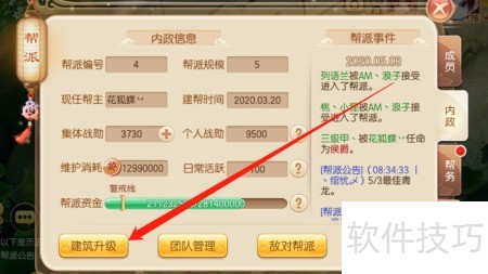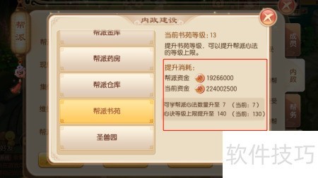 6、 进入帮派书苑,达成条件后点击升级按钮即可提升等级。
