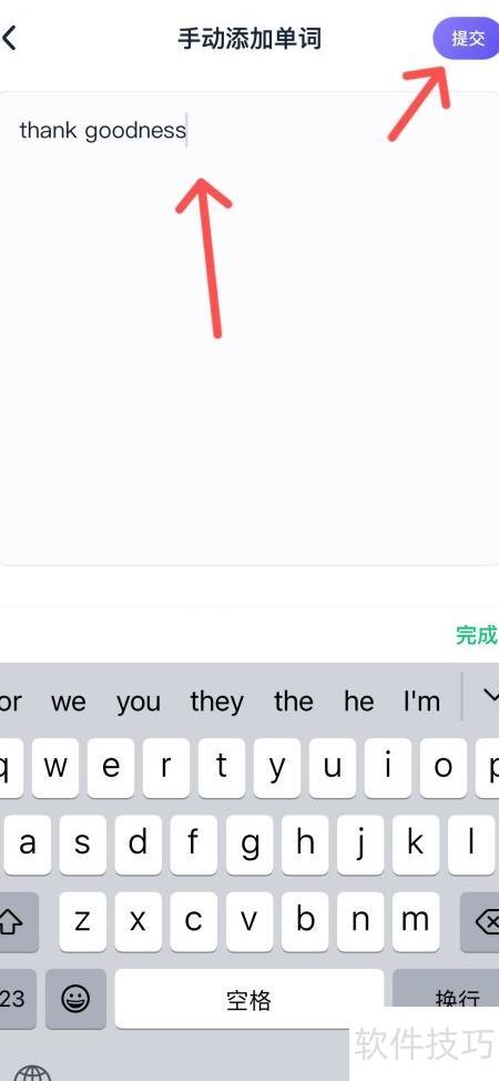 4、 在手动添加单词界面输入词汇后,点击右上角提交按钮即可完成操作。