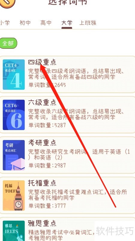 布丁单词查看四级重点词方法如下,详细步骤请看下文说明。 1、 第一步 2、 第二步 3、 第三步 ...