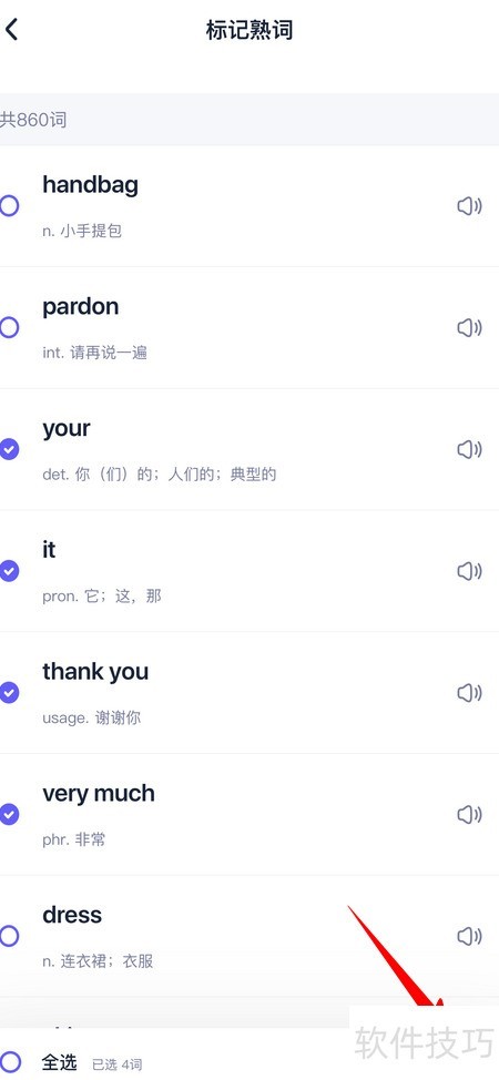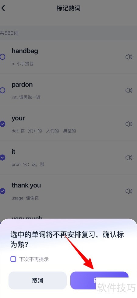 6、 勾选词书中已掌握的词汇,点击右下角熟字确认。