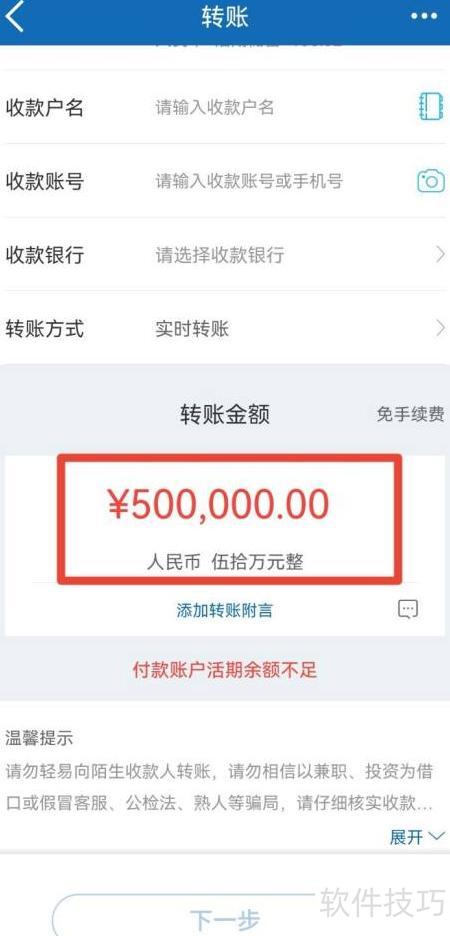 2、 进入转账页面,在金额栏输入指定数目,确认后即可完成五十万元的转账。