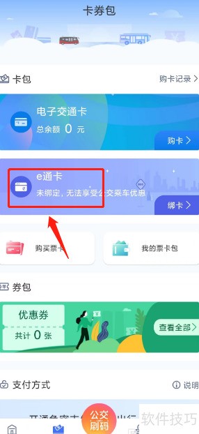 1、 打开厦门公交应用,进入卡券包,点击图示的E通卡选项即可。