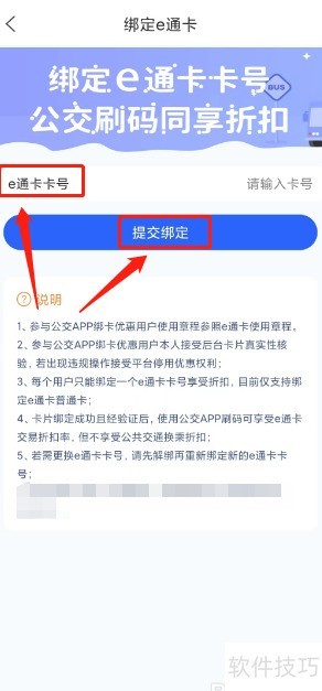 2、 进入E通卡绑定页面,输入卡号后点击提交绑定按钮即可。