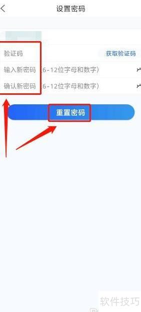 7、 进入密码设置页面,填写验证码及新密码,确认后点击重置按钮完成操作。