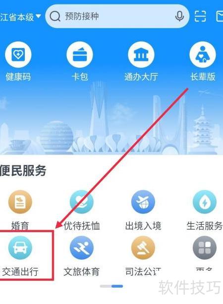 1、 打开浙里办APP,进入首页,点击交通出行即可。