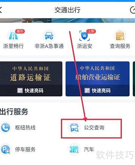 2、 进入交通出行页面后,点击出行服务下的公交查询功能。