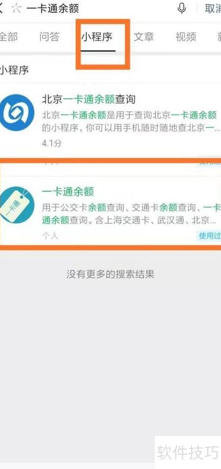 2、 在搜索栏输入一卡通余额,点击搜索后选择小程序类别,进入所示的一卡通余额小程序即可。