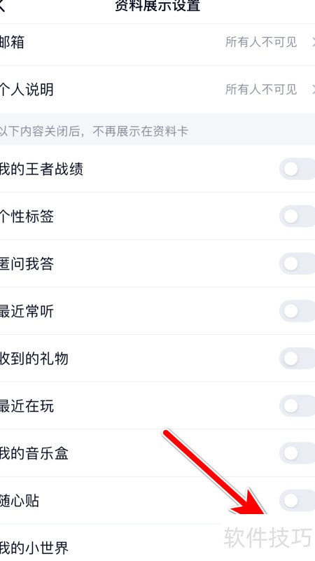 10、 关闭开关即可停止在资料卡上展示我的小世界。