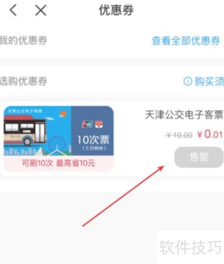 4、 只需支付一分钱即可抢购天津公交优惠券,可惜今日优惠券已抢光,未能成功领取。