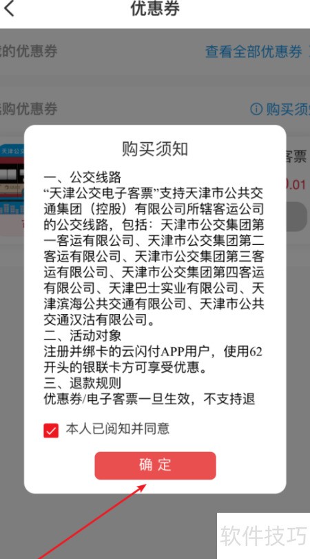 3、 进入优惠券页面将弹出购买须知,勾选已阅读并同意后点击确认即可。