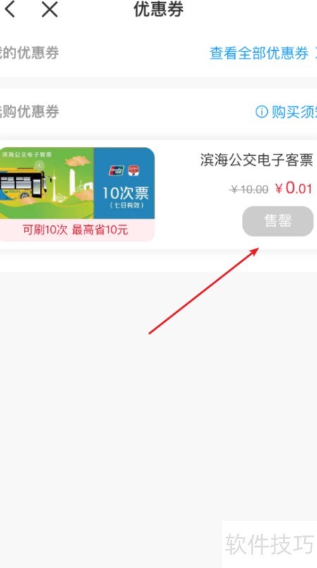 5、 滨海公交优惠券可按同样方式领取,成功后仅需一分钱即可享五折乘车。