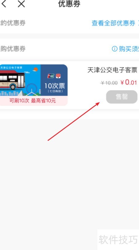 4、 只需支付一元即可抢购天津公交优惠券,可惜今日券已抢光,未能成功领取。