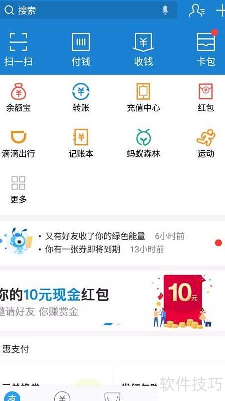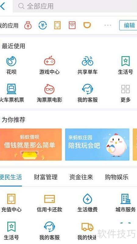 1、 打开支付宝首页,找到应用并点击更多按钮进入。