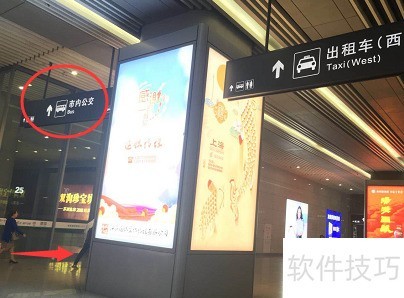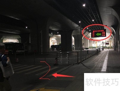 2、 按指示牌穿过门厅,见一立牌标市内公交指向前方,但前方为墙,需右转前行。