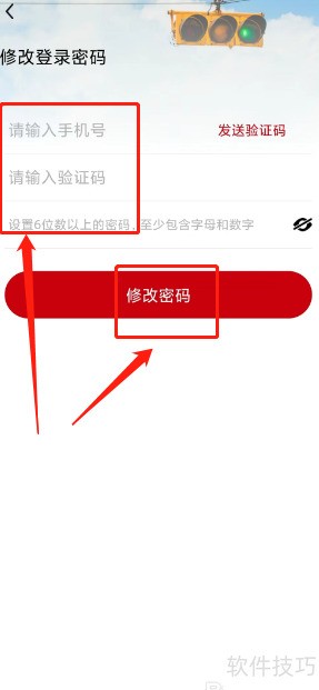 4、 进入密码修改页面,输入手机号、验证码及新密码后,点击确认修改。