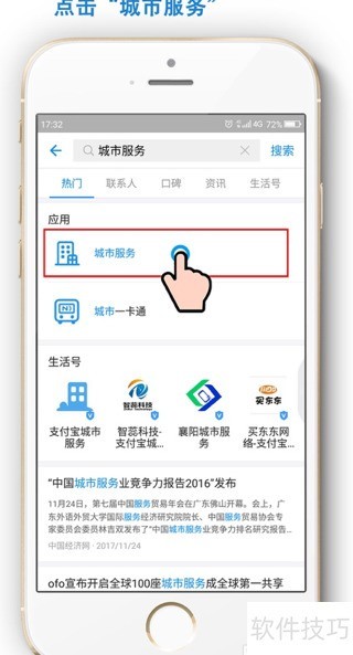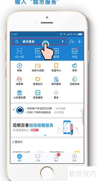 1、 打开手机支付宝,在首页搜索栏输入城市服务并进入该功能板块。