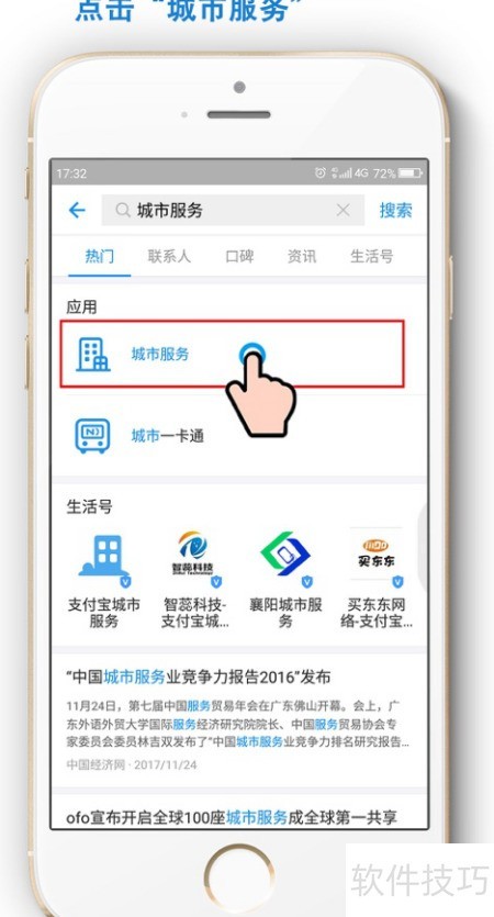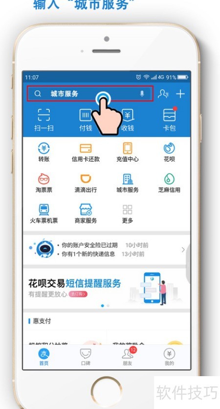 3、 打开支付宝,在首页顶部搜索框输入城市服务即可。