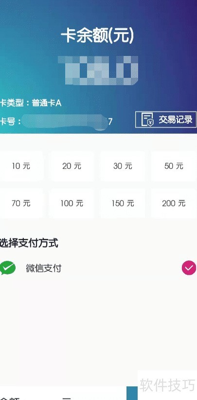 5、 充值成功后,页面将显示卡号及余额,下方选择金...