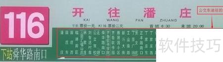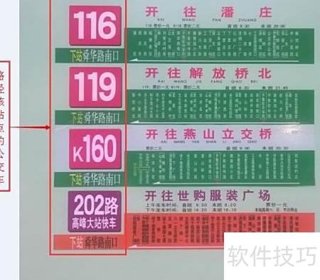 7、 通过公交站牌,可查看当前站点途经的所有公交线路及停靠站点。中红框所示(红色箭头指向区域),清晰标注了相关信息。