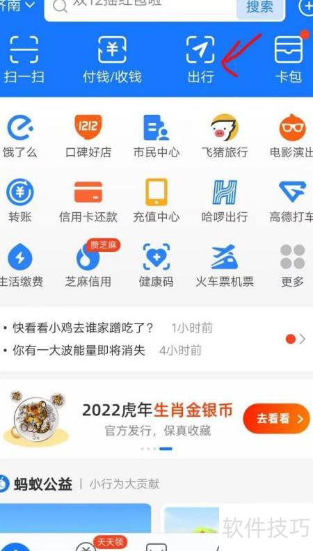 1、 打开支付宝APP,点击出行功能。