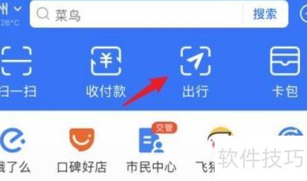 1、 打开支付宝,点击出行即可。