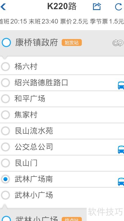 3、 选择一条公交线路进入详情页面,可查看首末班车时间、季节性票价及途经站点等信息。页面右侧显示公交车实时位置图标,便于跟踪车辆运行轨迹。若错过当前班次,可立即了解下一班车到达时间,掌握出行节奏更轻松。