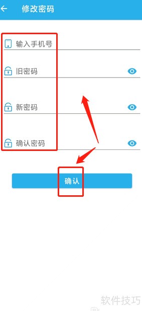4、 进入密码修改页面,填写手机号、旧密码及新密码并确认。