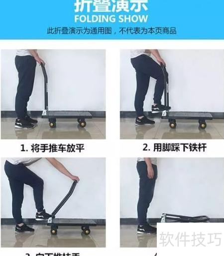 4、 使用餐馆推车时,先将其放平,再用脚踩下铁杆完成折叠,注意按步骤操作确保安全顺畅。
