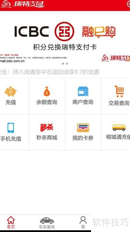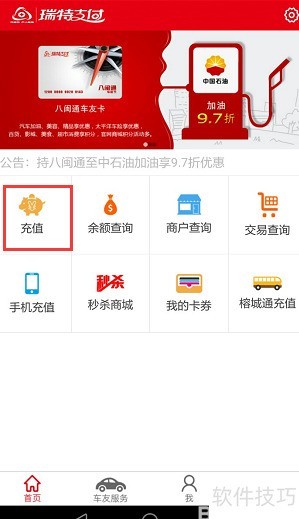 3、 进入首页,点击充值,选择瑞特支付卡,选定榕城通联名卡号,输入金额后确认完成充值操作。
