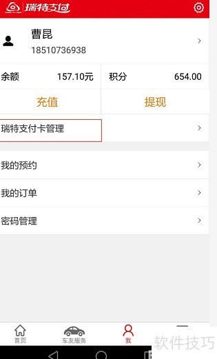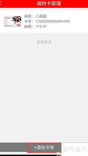 2、 注册完成后,使用注册时的手机号和密码登录,进入底部导航栏的我页面,选择瑞特支付卡管理,点击添加卡号,将实体卡号绑定至当前账户,具体操作流程详见图示。