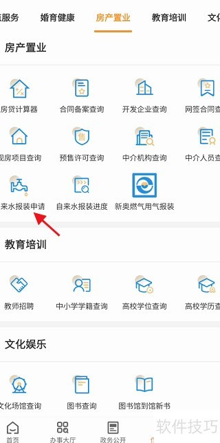 4、 进入便民服务,查找房产相关业务,选择自来水报装申请即可办理。