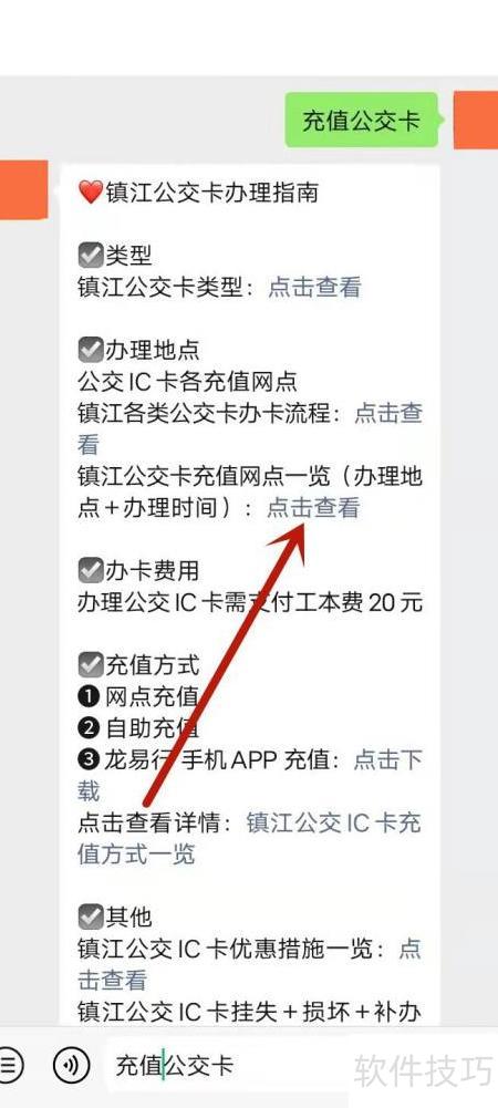 打开微信,搜索镇江本地宝,咨询公交卡充值问题,获取回复中的网点列表,查看各点详细地址及营业时间。
