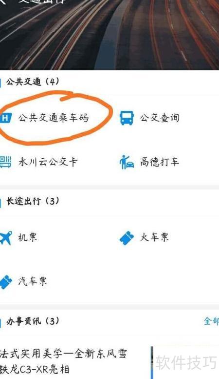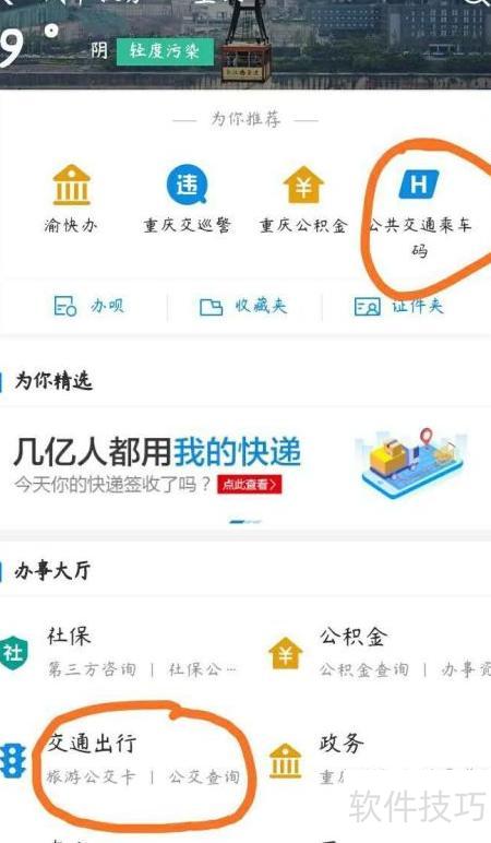 3、 进入界面后,点击下方圆圈标注的交通出行,即可查看上方的公共交通乘车码。