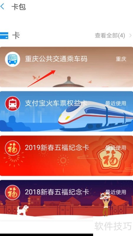 4、 进入卡包后,点击重庆公共交通乘车码即可,操作所示。