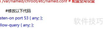 4、 修改文件 /var/named/chroot/etc/named.conf,调整全局配置参数以满足服务运行需求。