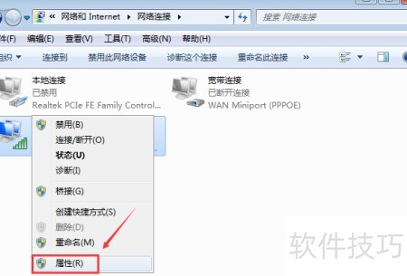 2、 右键点击已连接的本地或无线网络,选择属性进行设置。