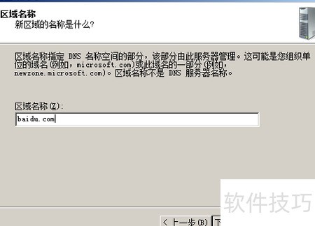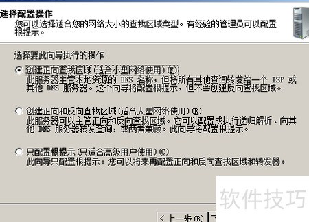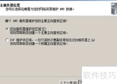 5、 若将本机设为DNS服务器,请选第一项;如配置网络中的DNS服务器,则选择由ISP管理的区域,确认后点击下一步,进入区域名称设置界面。