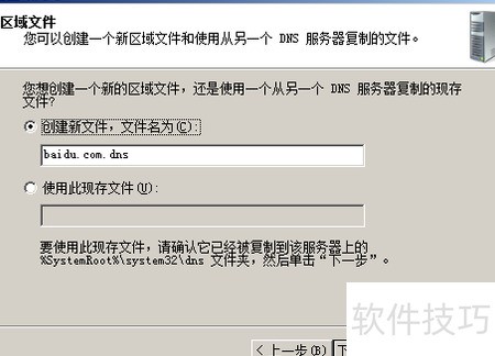 7、 可在此创建新的区域文件,或通过复制其他DNS服务器的文件来生成DNS区域文件。通常保持默认设置即可,直接点击下一步进入动态更新配置界面。