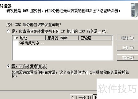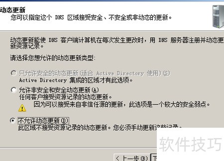 8、 动态更新功能可让DNS客户端在每次变更后自动向DNS服务器注册并刷新资源记录。单击下一步即可进入DNS转发器配置界面。
