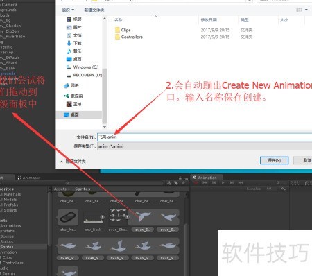 3、 同时选中这八个Sprite对象并拖入Hierarchy面板时,Unity不会将其作为独立对象导入,而是自动弹出创建新动画窗口。此时只需输入动画文件名称并保存,系统便会自动生成对应的动画剪辑资源,整个过程无需手动创建动画控制器或额外配置。