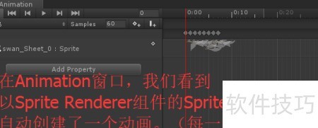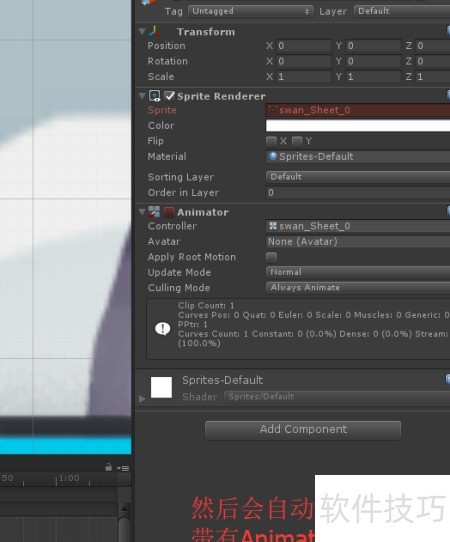 4、 画面中自动生成了一个游戏对象,包含用于呈现天鹅图像的精灵渲染器组件,以及负责操控动画效果的动画控制器组件。