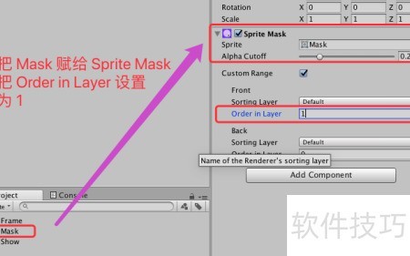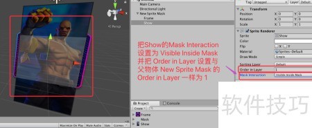 7、 将Show图的Mask Interaction设为Visible Inside Mask,并将其Order in Layer数值调整为与父物体Sprite Mask的Order in Layer相同,统一设为1,以确保显示正常。若两者数值不一致,可能导致遮罩效果失效。具体设置方式所示,请参照进行配置以实现正确的遮罩显示效果。